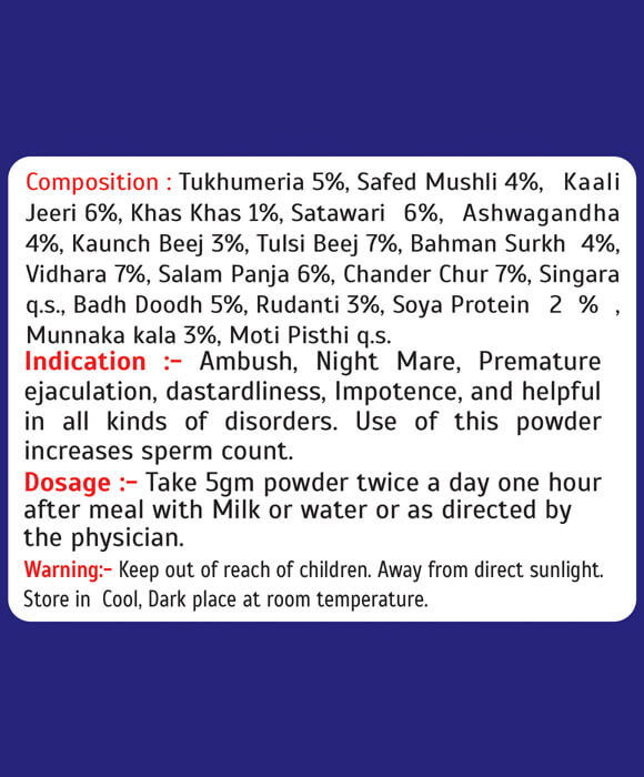 Tukhumeria, Safed Mushli, Kaali Jeeri, Khas Khas, Satavari, Ashwagandha this are the rich ingredients used in Man care powder. This ingredients are very powerful in providing best sexual health for men.